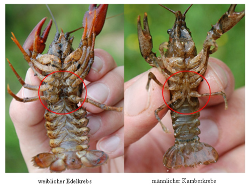 Die Geschlechtsbestimmung bei Flusskrebsen geschieht anhand der Anordnung der Gonopoden. Beim männlichen Flusskrebs liegen die Gonopoden über den ersten Schreitbeinen. Beim Weibchen liegen keine Gonopoden über den ersten Schreitbeinen